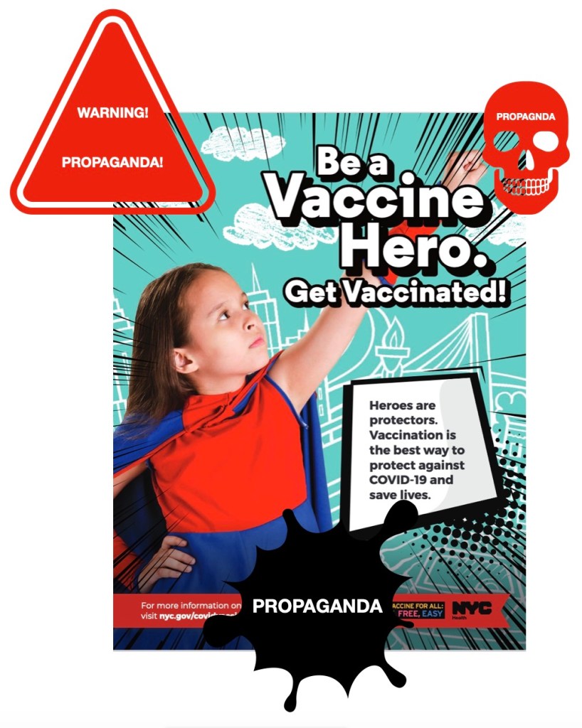 Toy companies prepare for the Christmas season by using advertising techniques to convince children that they absolutely MUST have the latest toy. The children then go to their parents and wage their own campaign to convince the adults (the real consumers) to buy the toy. The image above uses a child’s fantasies to manipulate her into demanding a Covid 19 vaccine.