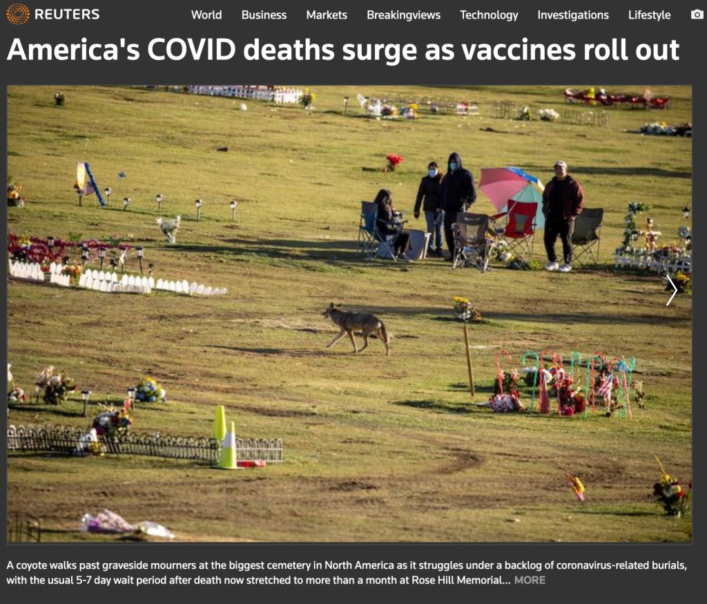 “A coyote walks past graveside mourners at the biggest cemetery in North America as it struggles under a backlog of coronavirus-related burials, with the usual 5-7 day wait period after death now stretched to more than a month at Rose Hill Memorial Park and Mortuary, during the outbreak of the coronavirus in California, January 26, 2021. ” REUTERS/Mike Blake