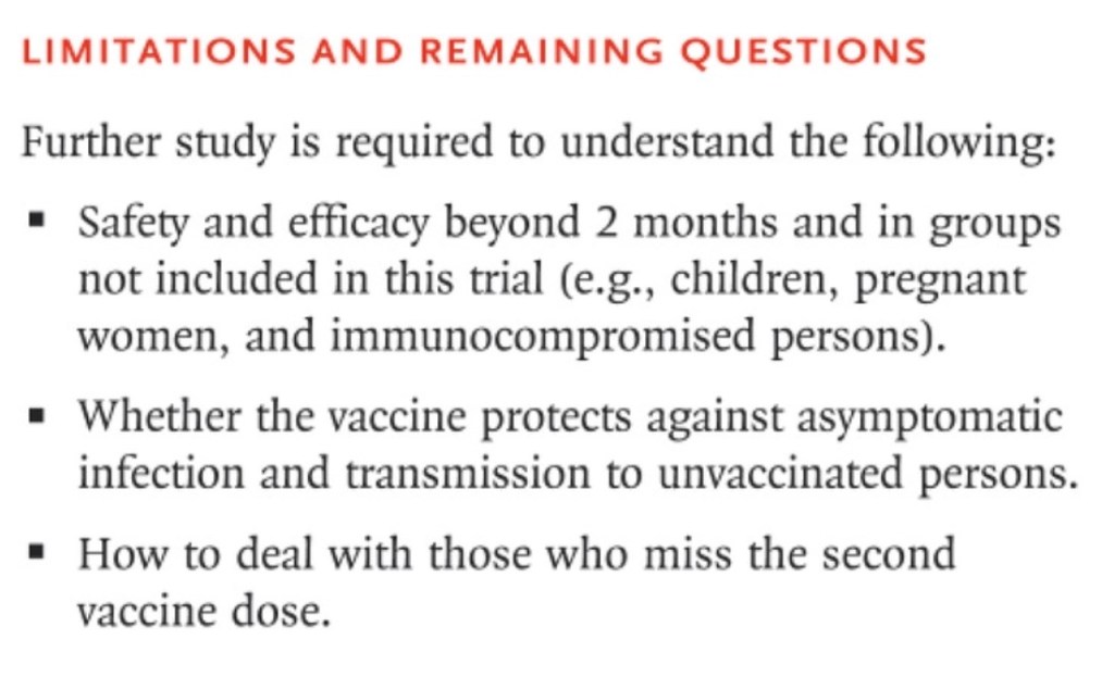 “This report includes 2 months of follow-up after the second dose of vaccine for half the trial participants and up to 14 weeks’ maximum follow-up for a smaller subset. Therefore, both the occurrence of adverse events more than 2 to 3.5 months after the second dose and more comprehensive information on the duration of protection remain to be determinedThese data do not address whether vaccination prevents asymptomatic infectionThis report does not address the prevention of Covid-19 in pregnant women…”