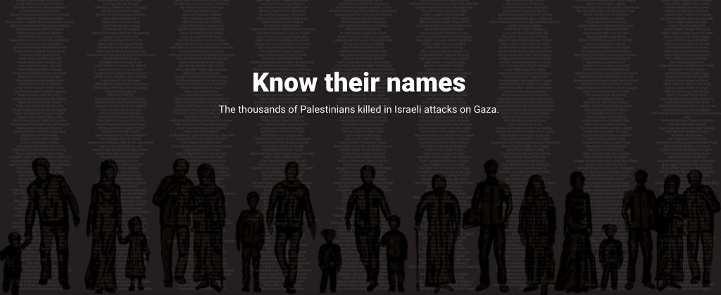 #43 Know Their Names https://www.aljazeera.com/news/longform/2023/11/1/know-their-names-palestinians-killed-in-israeli-attacks-on-gaza Related Leave a comment Cancel reply Δ