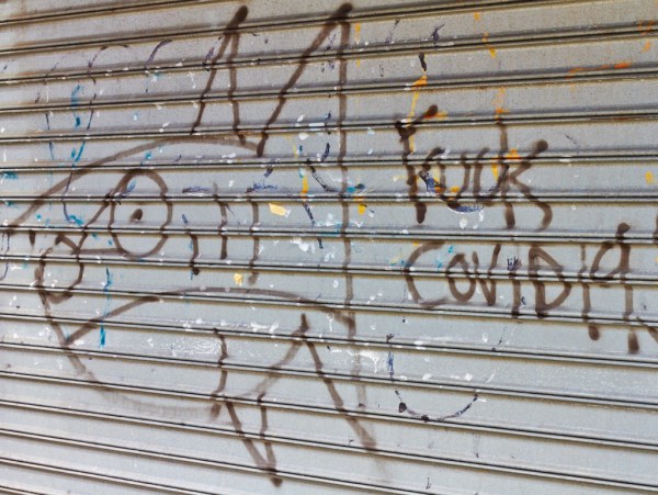 Graffiti on Steel, storefront security door, April 2020, NY. Humans communicate with symbols. The most popular are words, numbers, and images. Here you see a photograph of an art form known as graffiti, or street art. It consists of a cartoon-like character—perhaps a shark (?); a forbidden word—sometimes referred to as the F-word; and a... Continue Reading →